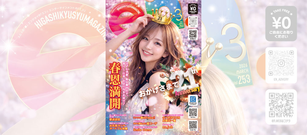 「東九州マガジンen.」3月号を発行しました 2026.02.28 「東九州マガジンen.」3月号を発行しました! 今月は、「春恩満開」おかげさまでen.も21周年を迎えることができました。 はずむ季節、街も動き出す季節です。 暮らし・仕事・お店の旬をお届けします。 Post Share Pin it 東九州マガジンen.2月号を発行しました。 前の記事